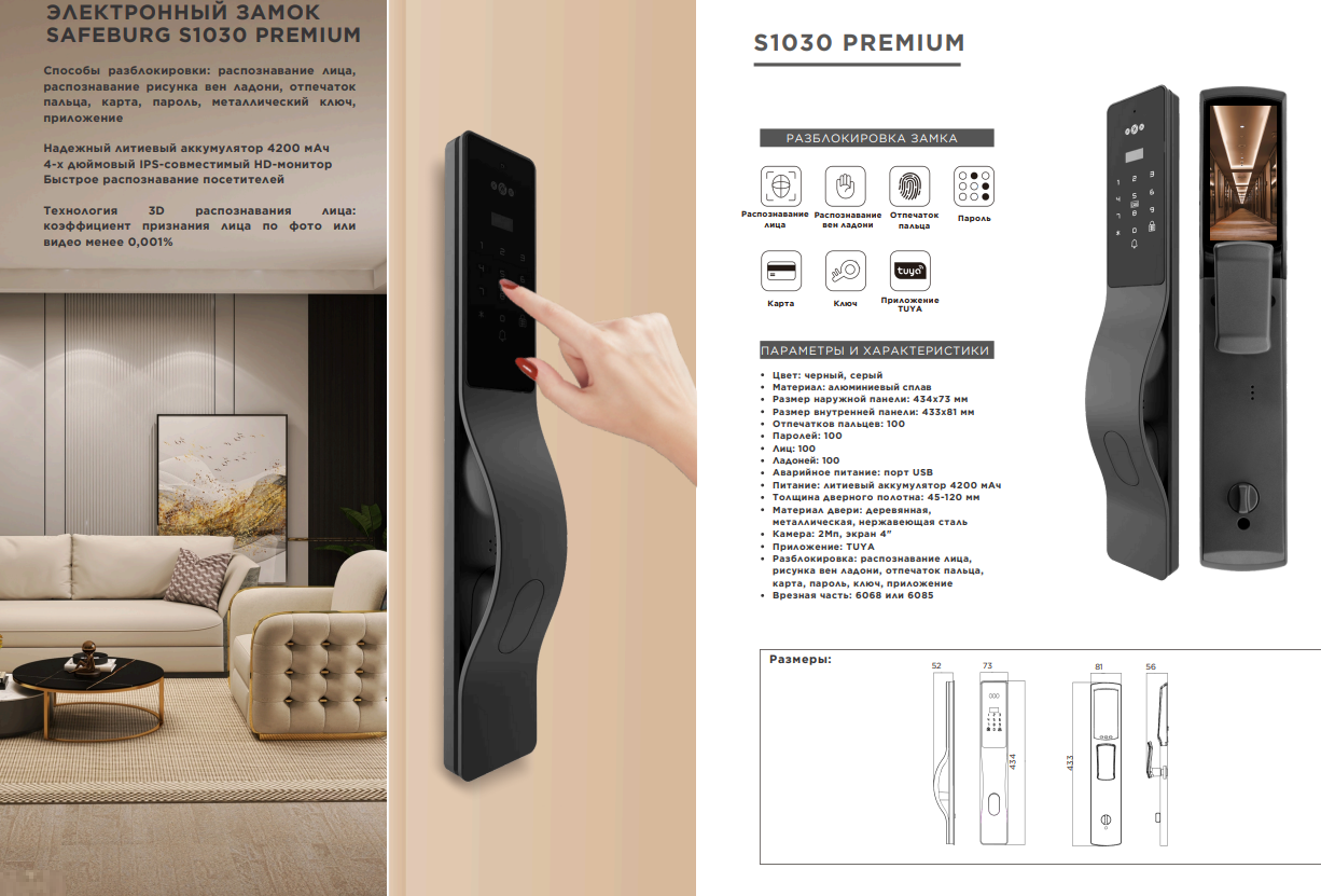 Высокий уровень безопасности и удобство в использовании делают SAFEBURG S1030 Premium одним из самых популярных врезных биометрических замков на рынке.