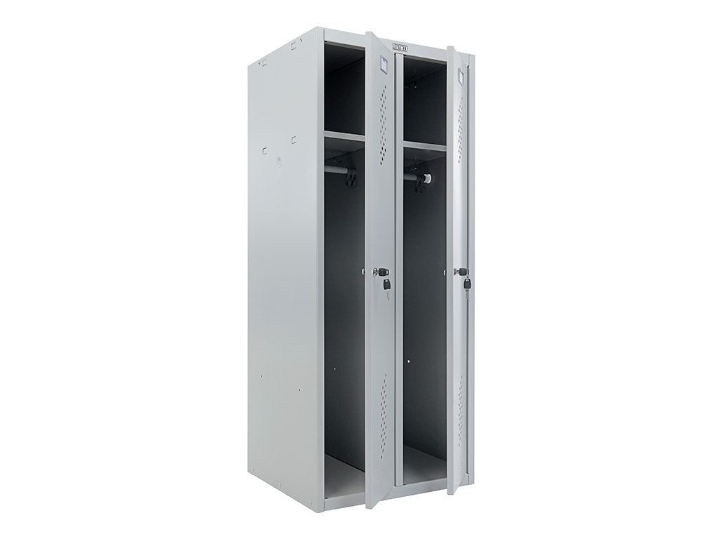Прочная конструкция из металла с защитным покрытием не боится механических воздействий и коррозии. Такое изделие можно без опаски устанавливать в гардеробных производственных помещений, где повышен уровень влажности — прослужит долго. Размеры модели (высота, ширина, глубина): 1500×800×500 мм.